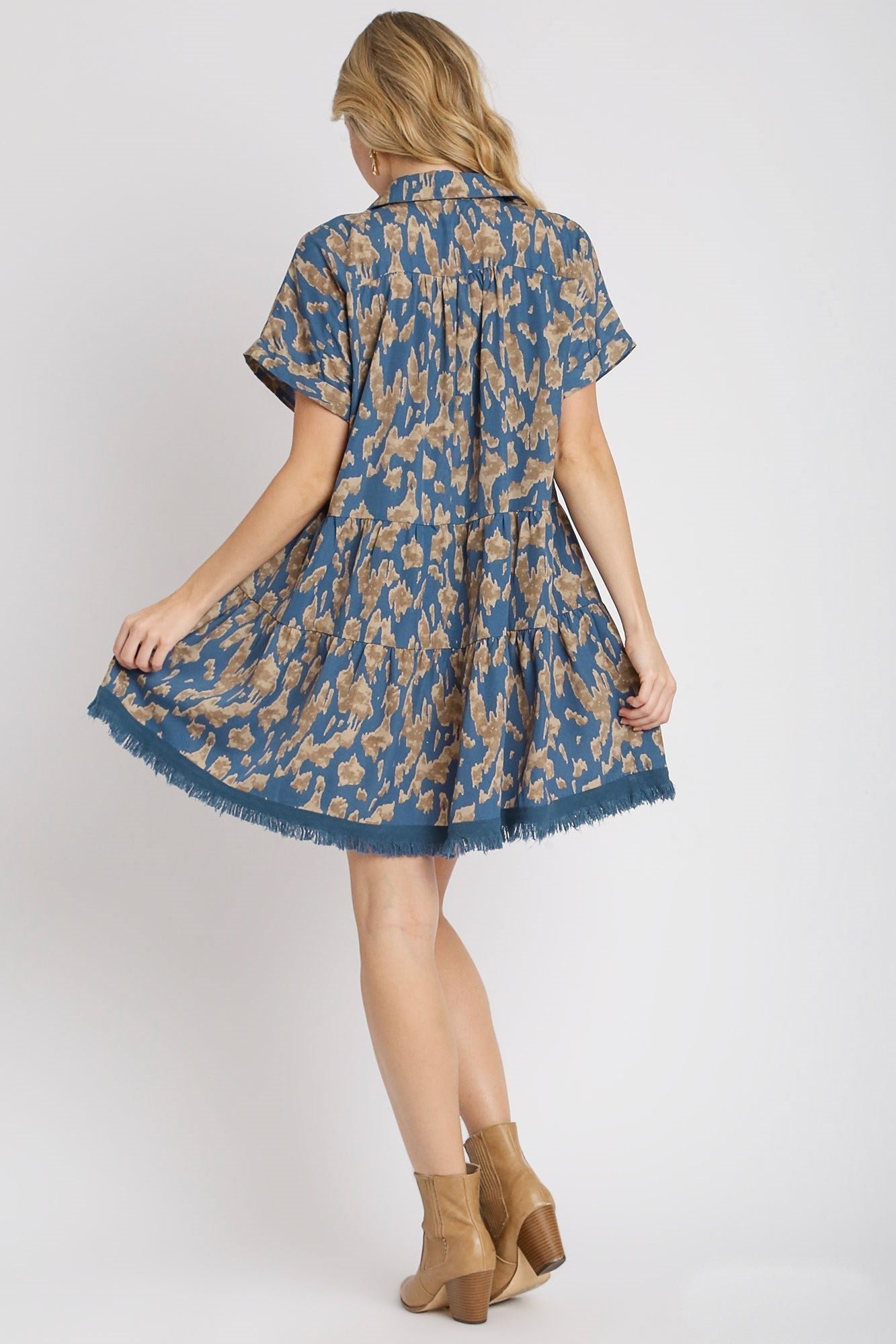 Trendy animal print dress by Umgee featuring a tiered design, short sleeves, collared neckline, and frayed hem.? Great to layer with a jacket!? Belt not included.? We love the animal print and flattering tiered style.? This dress is perfect for fall and will make a great go-to piece in your closet!